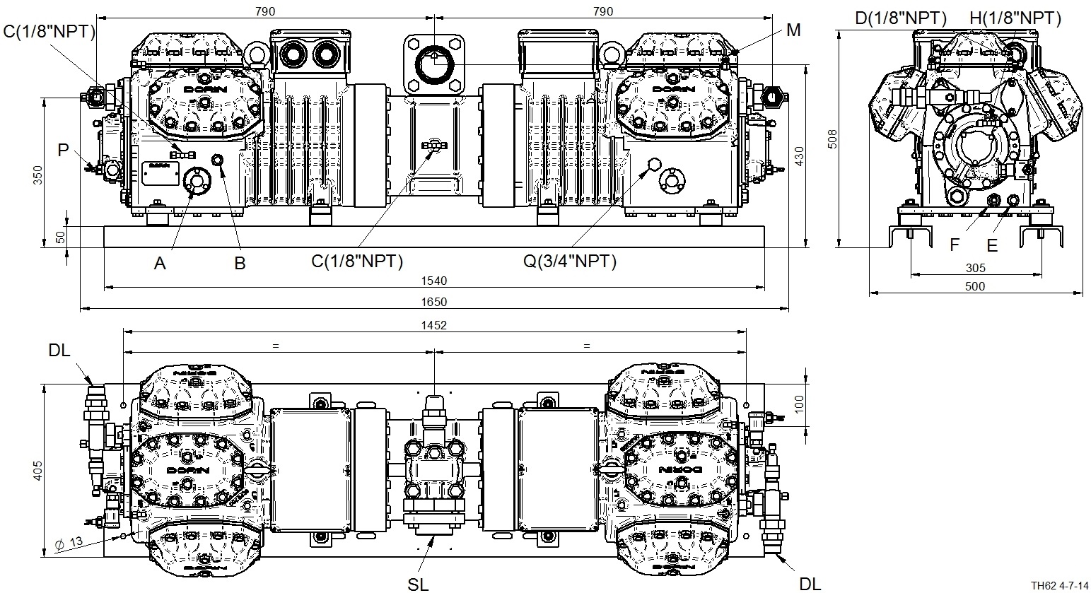 LegendaA - 油视镜B - 注油塞C - 低压旋塞D - 高压旋塞E - 排油塞F - 曲轴箱加热器H - 油泵高压旋塞M - 最高排气温度传感器P - 油压差开关Q - 气平衡DL - 排气阀SL - 吸气阀